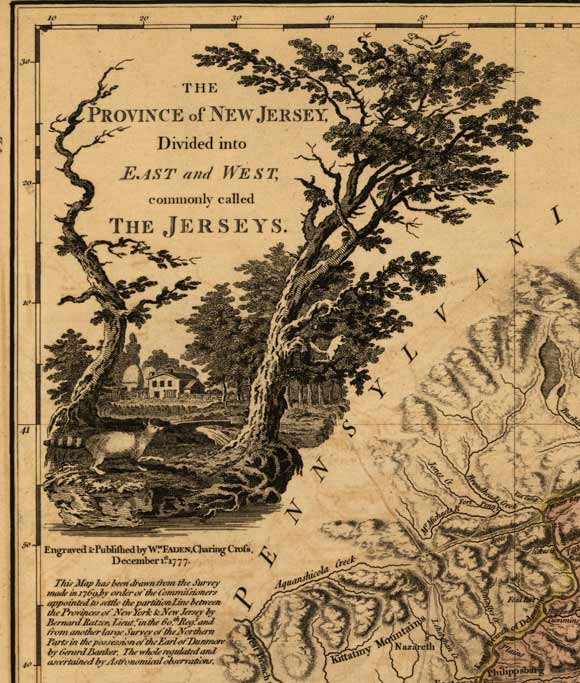 This engraving is from a map published in 1777 of "The Province of New Jersey, divided into East and West New Jersey. The map has been drawn from the survey made in 1769...by Bernard Ratzer...and from another large survey of the Northern Parts...by Gerard Banker". You can see in this detail of the map squirrels, a raccoon with a farm house and silos in the background.